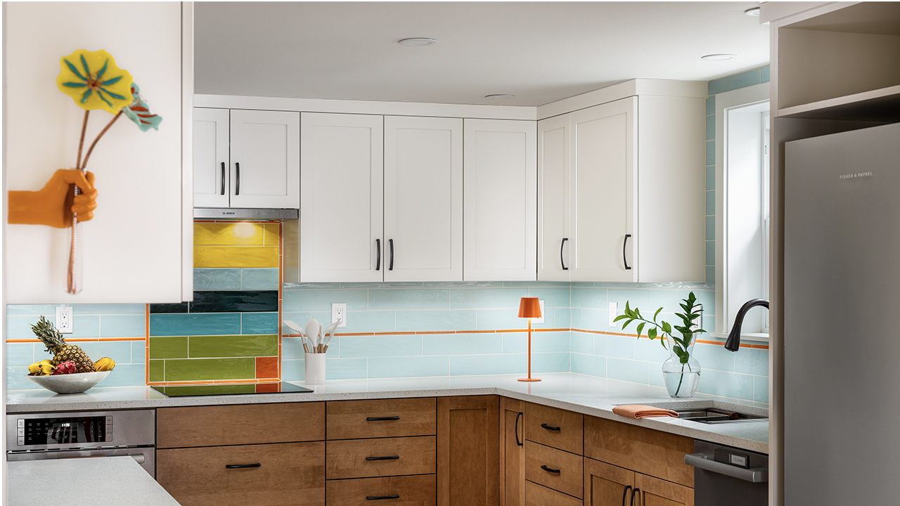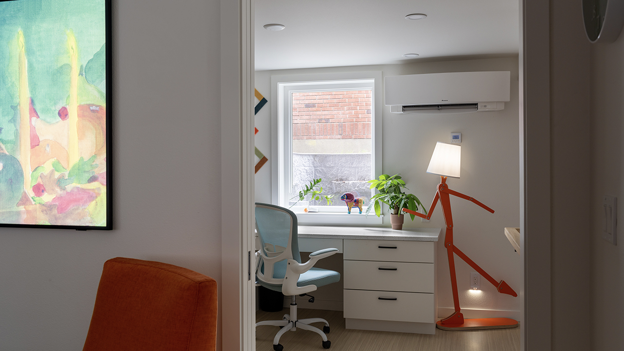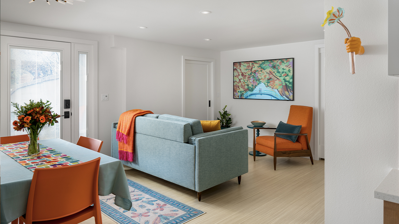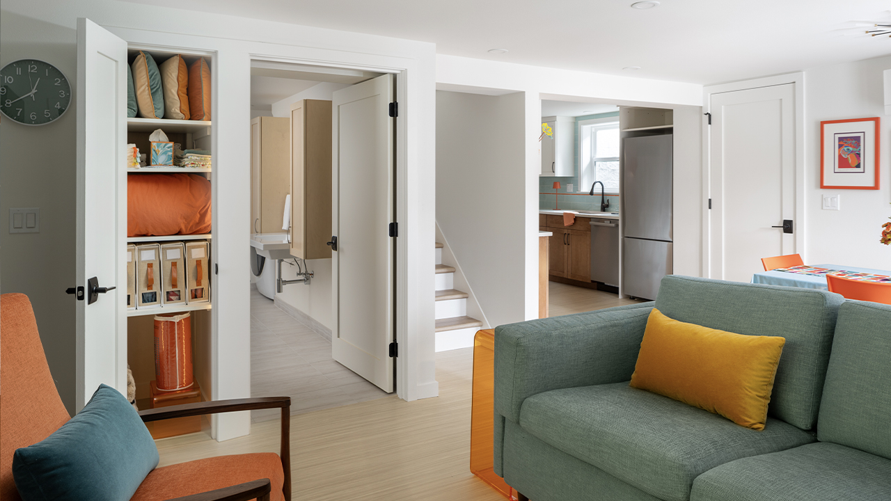 An 800 sq. ft. dark daylight basement in a 1932 Brick Tudor home was transformed into a bright, highly functional and fully wheelchair accessible ADU, embracing the concept of living large in a small space. The overall layout was dictated in part, by the location of the fireplace support structure, staircase, exterior entry and proximity to the upstairs water and waste lines. Additional considerations included installing a 2″ x 6″ interior perimeter framing wall for R-21 insulation, removing the force air furnace and air handler in favor of two ductless mini splits and the code required egress windows/window wells which have the added benefit of providing natural light. Once the structural and code compliant aspects of the project were met, the design came to fruition as a fully wheelchair accessible abode with high contrast materials for wayfinding and ease of identification. The compact space feels generously proportioned with a fully functioning kitchen with plenty of storage/counter space that can accommodate a wheelchair user and a wet room-style bathroom that is safe, accommodating and has sufficient room for a caregiver. The combined entry, dining room, living room and spacious storage closets facilitate socializing and entertaining with comfort and ease. The ‘private’ office/dressing room (including a thoughtfully organized closet) and bedroom provide a beautifully structured separation between the ADU’s public and private spaces. The linen closet has interior lighting and can be accessed from the living room or from the bathroom. The coat closet has been divided to provide specific storage needs beyond coats such as a vacuum. The materials throughout the ADU were selected for their high durability and low maintenance characteristics, especially the linoleum and porcelain tile flooring, quartz countertops, and maple cabinetry. The colorful finishes and thoughtful lighting create a bright, beautiful and inviting interior.