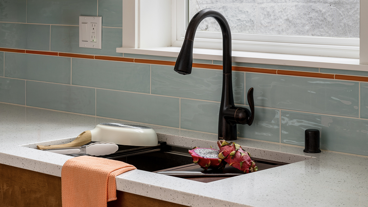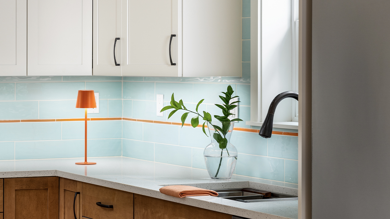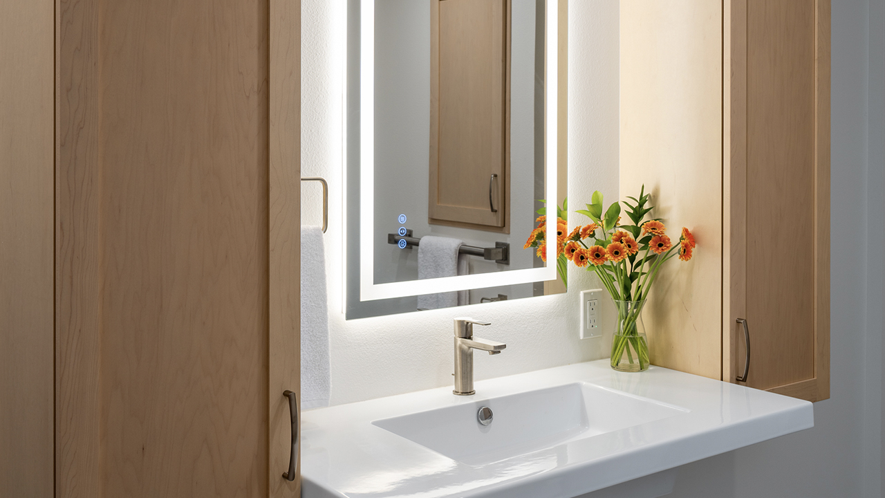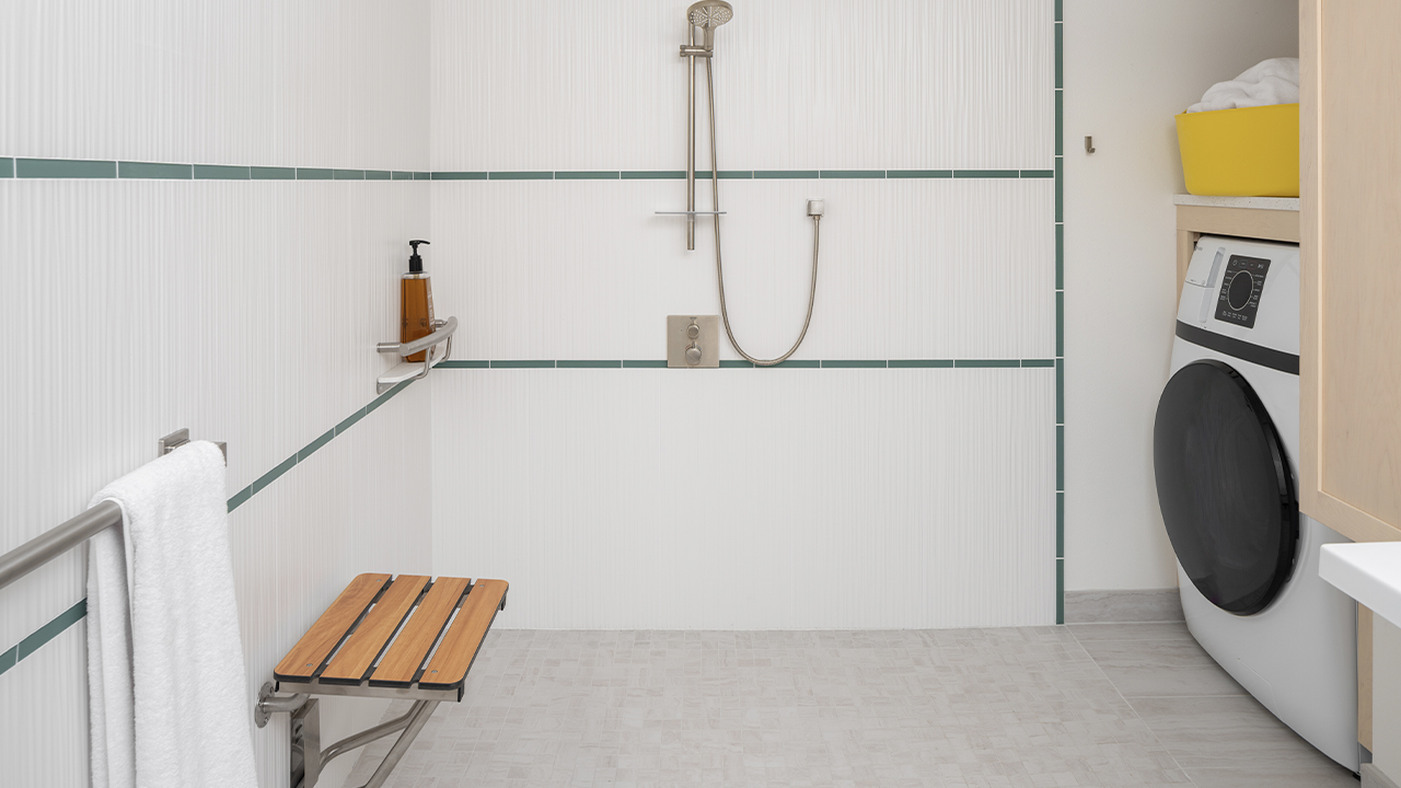 An 800 sq. ft. dark daylight basement in a 1932 Brick Tudor home was transformed into a bright, highly functional and fully wheelchair accessible ADU, embracing the concept of living large in a small space. The overall layout was dictated in part, by the location of the fireplace support structure, staircase, exterior entry and proximity to the upstairs water and waste lines. Additional considerations included installing a 2″ x 6″ interior perimeter framing wall for R-21 insulation, removing the force air furnace and air handler in favor of two ductless mini splits and the code required egress windows/window wells which have the added benefit of providing natural light. Once the structural and code compliant aspects of the project were met, the design came to fruition as a fully wheelchair accessible abode with high contrast materials for wayfinding and ease of identification. The compact space feels generously proportioned with a fully functioning kitchen with plenty of storage/counter space that can accommodate a wheelchair user and a wet room-style bathroom that is safe, accommodating and has sufficient room for a caregiver. The combined entry, dining room, living room and spacious storage closets facilitate socializing and entertaining with comfort and ease. The ‘private’ office/dressing room (including a thoughtfully organized closet) and bedroom provide a beautifully structured separation between the ADU’s public and private spaces. The linen closet has interior lighting and can be accessed from the living room or from the bathroom. The coat closet has been divided to provide specific storage needs beyond coats such as a vacuum. The materials throughout the ADU were selected for their high durability and low maintenance characteristics, especially the linoleum and porcelain tile flooring, quartz countertops, and maple cabinetry. The colorful finishes and thoughtful lighting create a bright, beautiful and inviting interior.